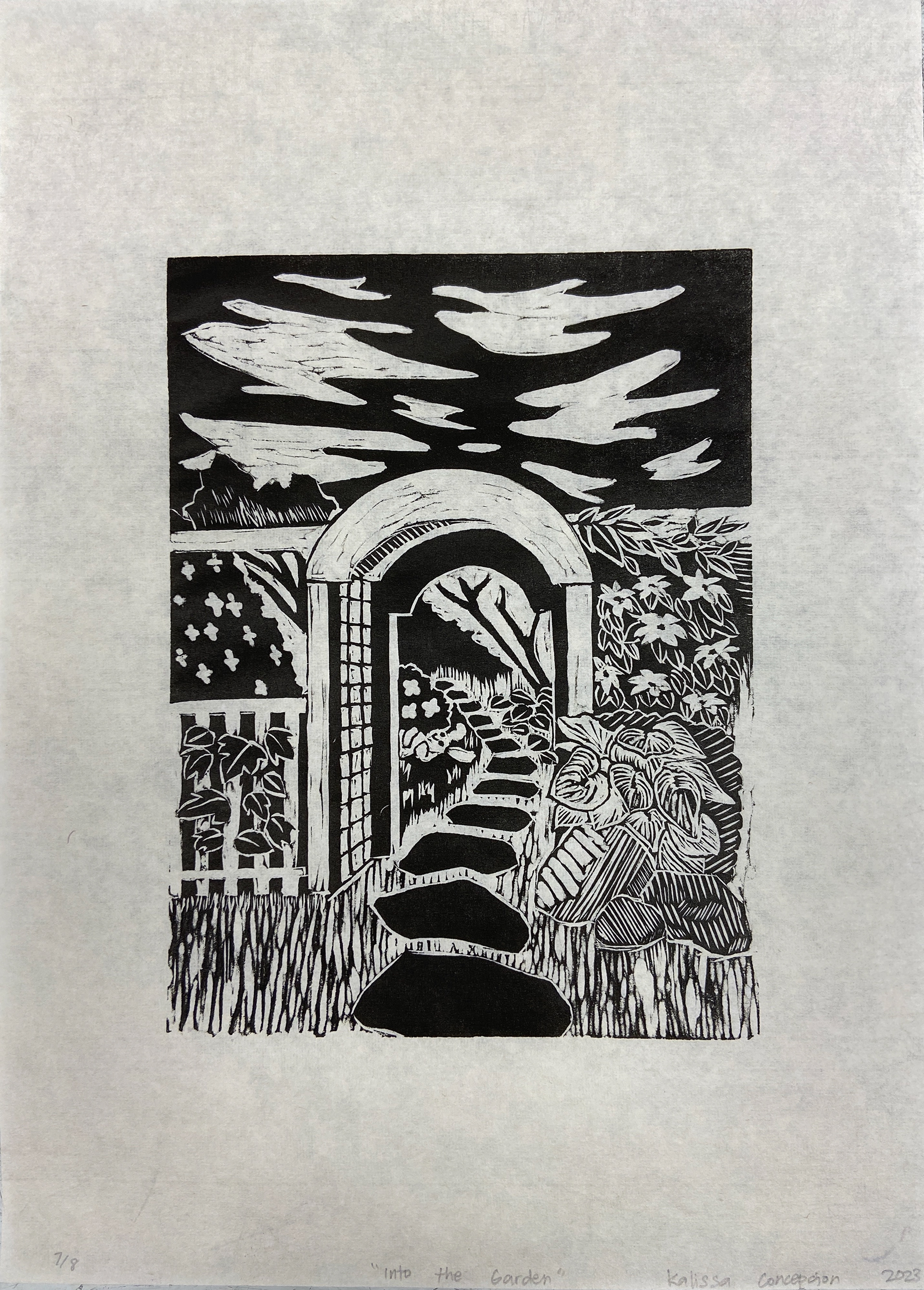 Into the Garden, 2023, linocut on Japanese paper, 9 x 12 inches